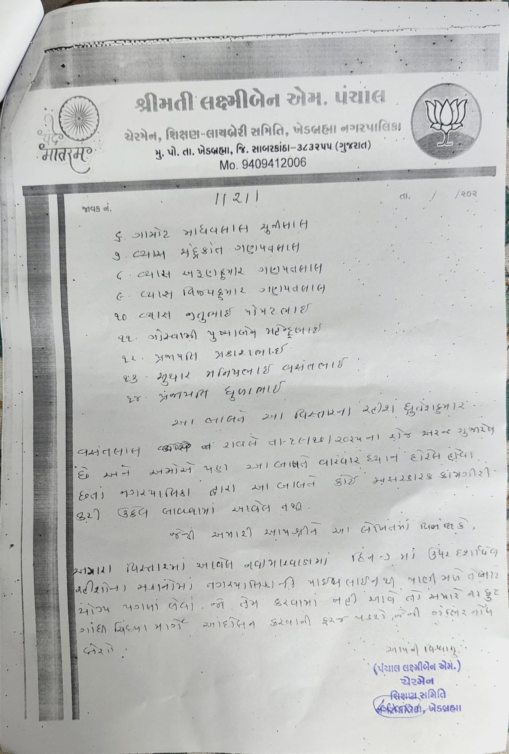 વોર્ડ નંબર 6ના ચૂંટાયેલા ભાજપના કોર્પોરેટર અને શિક્ષણ સમિતિના ચેરમેન લક્ષ્મીબેન એમ. પંચાલના લેટરપેડ પર આ લેખિત રજૂઆત કરવામાં આવી હતી.