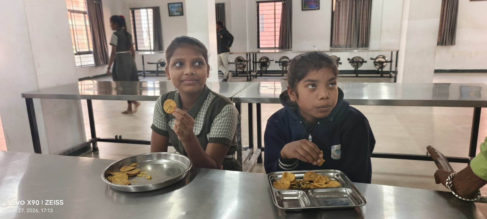 શાળામાં વિદ્યાર્થીઓને નિયમિત અને ગુણવત્તાયુક્ત અભ્યાસક્રમ સાથે શુદ્ધ, સાત્વિક અને પોષણયુક્ત ભોજન તથા નાસ્તો સમયસર પૂરા પાડવામાં આવે છે. ભોજનની ગુણવત્તા, સ્વચ્છતા અને આરોગ્યલક્ષી માપદંડોનું સંપૂર્ણ પાલન સુનિશ્ચિત કરવામાં આવે છે.