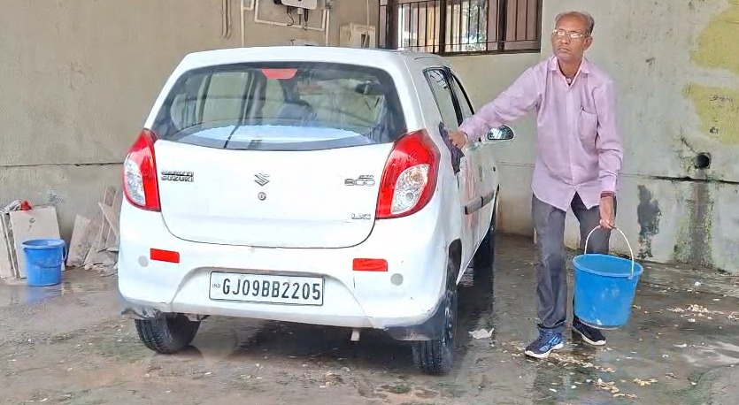 આ કર્મચારી નુ શોષણ કે પાણી નો વેડફાટ ખેડબ્રહ્મા લાઇબ્રેરીયન દ્વારા હંગામી કર્મચારી પાસે ગાડી ધોવડાવે